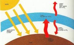 Les rayonnements solaires arrivent jusqu’au sol qui les absorbe, il le reémet ensuite sous forme de rayonnement infrarouge, c’est ce rayonnement inoffensif et indispensable pour une vie sur notre Terre qui est stoppé par les gaz à effet de serre (gaz carbonique, méthane, protoxyde d’azote). Une certaine quantité de chaleur (rayonnement infrarouge) est ainsi maintenue en surface.